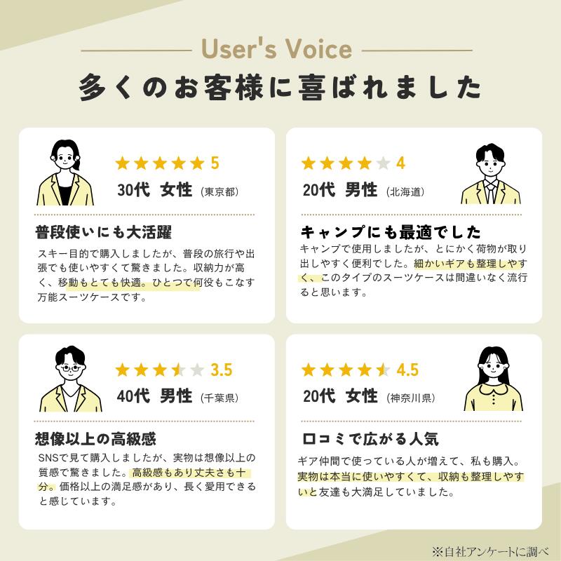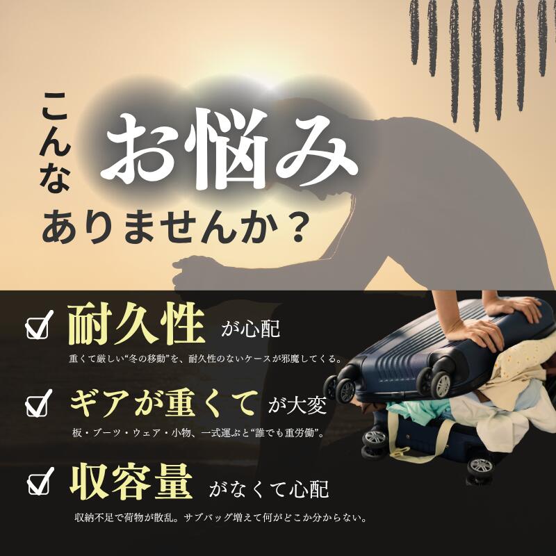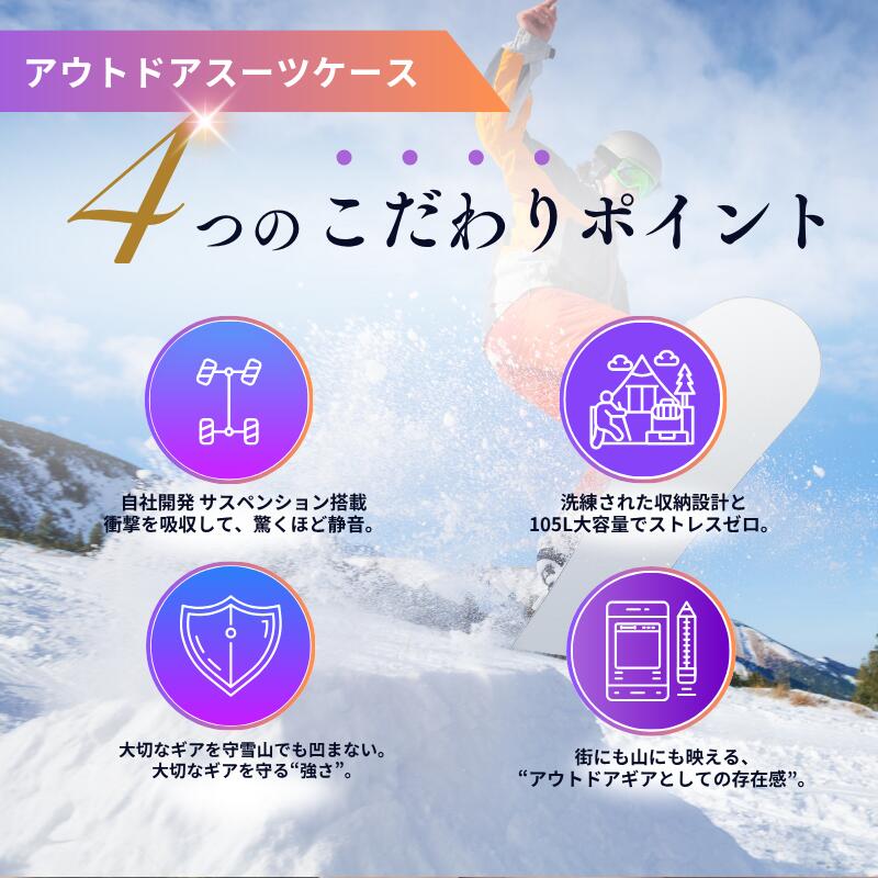 スキー遠征はもちろん、普段の旅行や出張でも大活躍。105Lの大容量と静音キャスターで移動が快適に。使うシーンを選ばない、多機能スーツケースの新定番。